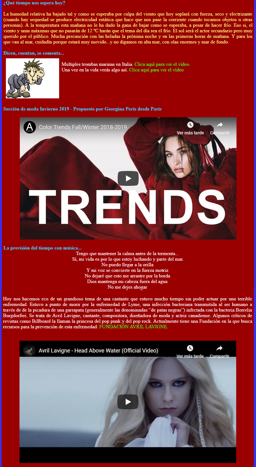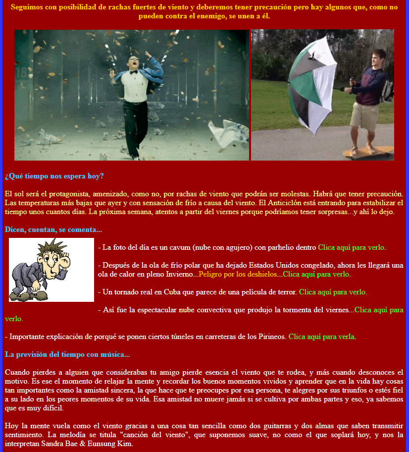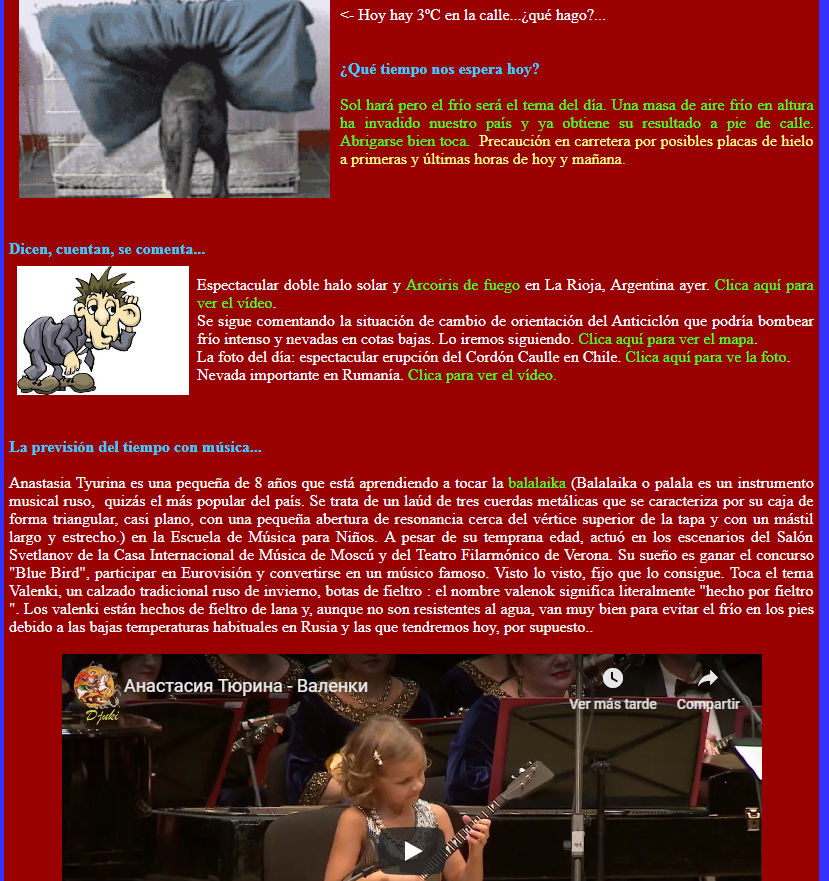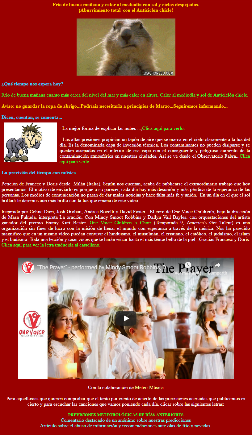 Pues eso...Poco que decir. Sol y tiempo estable. A Abrigarse de buena mañana y manga corta al mediodía. Tiempo de resfriados. "Hoy es un día soleado, el color de la alegría..."Esto es lo que nos cuenta la canción carnavalesca Magalenha interpretada en esta ocasión por Simon Fava & Gregor Salto del músico y compositor brasileño de bossa nova, uno de los referentes internacionales de la música brasileña el gran Sergio Mendes.Nubes que están en modo fin de semana y no les da la gana de lanzar gotas de lluvia. Poco a poco, las nubes darán paso a un sol juguetón y con unas temperaturas agradables con tendencia a ir descendiendo. Las altas presiones asegurarán los próximos días tiempo seco, soleado y muy aburrido. Nubes de colores, eso es lo que tendremos hoy de paseo por el cielo y lo que nos cantará la gran Rocío Durcal. El vídeo no se ve muy bien pero es que ya ha llovido mucho desde entonces y siempre está bien recordar aquellos días en los que una voz, una actriz y una gran persona de nuestro país, iluminaba los hogares con su arte y nos regalaba palabras de amor.El protagonismo de la jornada se lo robará al sol el viento. Algunas rachas podrán ser fuertes del Oeste, un viento que hace recalentar las temperaturas que hoy podrán incluso rozar los 20ºC de máxima. El mar un poco más alterado y mañana llega un frente en territorio enemigo (el Anticiclón) que podrá dar chubascos poco importantes. La próxima semana...Anticiclón chicle. Nos vamos hoy con el viento del Oeste, o lo que es lo mismo, "The Western Wind" (el viento occidental) . Nos lo trae con su guitarra eléctrica en modo heavy metal...Doug Marks, músico, guitarrista y maestro de guitarra. Es el fundador y propietario de las lecciones de guitarra de Metal Method Video. Marks fundó Metal Method en 1982. Metal Method es una de las lecciones de video y guitarra más populares del mundo, y ha enseñado a más de 100,000 guitarristas hasta la fecha.Día de sol jugando al escondite con nubes altas que irán amorteciendo la luz de vez en cuando. Posibilidad de ver fenómenos ópticos como halos o parehelios y temperaturas agradables, más altas de lo normal. Mañana el viento con rachas fuertes del Oeste podrán disparar las temperaturas. No es fácil encontrar un vídeo musical meteorológico cada día y que se adapte al tiempo que tendremos... Por una parte, Descemer Bueno, un músico, cantante, compositor y productor cubano. Por otra Eliades Ochoa Bustamante, un guitarrista y cantante también cubano, una de las estrellas del Buena Vista Social Club y es, además, líder del Cuarteto Patria. Juntos cantan "preciosa"...y de verdad que lo es...Juzgad vosotr@s mism@s.Seguimos en modo Anticiclón y, por tanto, por mucha nube mona que deambule por ese cielo, un poco sucio de polución, no caerá ni una minúscula gota. La neblina puede ser normal durante el día, disminuyendo un poco la visibilidad. Temperaturas agradables. El fin de semana pinta tranquilo, con nubes de paseo y un Domingo que podríamos considerar cálido. El perfume de algunas flores, supervivientes del Invierno y el cielo de viejas ciudades que guardan su encanto, es lo que nos muestra un magnífico duo que se hace llamar "Las Vegas Band". A pesar de las neblinas o la mala visibilidad que podemos tener hoy, es viernes y vamos a clarear el día gracias a nuestros colaboradores Montse y Antonio de Barcelona, Que nos hacen llegar este magnífico tema italiano titulado "Vecchio paesello" (Pueblo viejo). ¡Feliz fin de semana!El Anticiclón ha perdido un poco de fuerza pero nos sigue manteniendo el tiempo estable y soleado. A la gente de mar les avisamos que pueden formarse bancos de niebla que podrían afectar también a zonas cercanas al litoral. Vaya lujo hoy tener en esta sección a la gran cantante y actriz española, Ana Belén. Hemos encontrado este verdadero homenaje al sol que nos alumbra casi cada mañana. La letra cuadra perfectamente con el día que tendremos hoy. ¡A disfrutar de esa prodijiosa voz que hace poco ha sacado un nuevo disco!