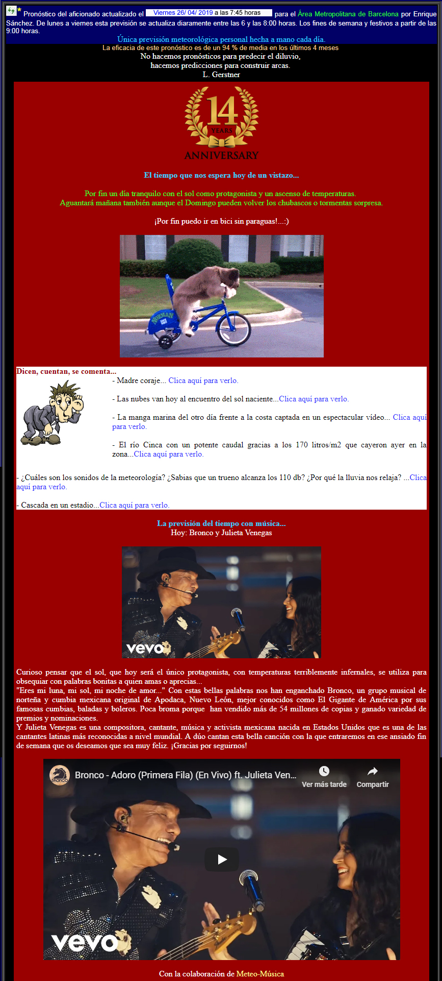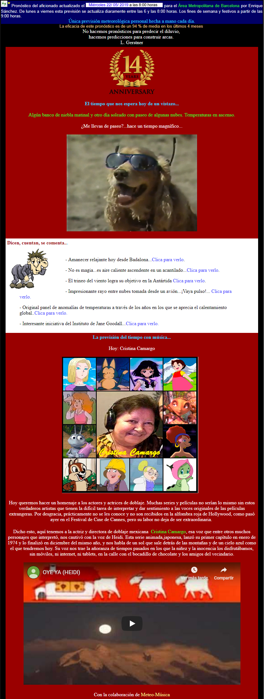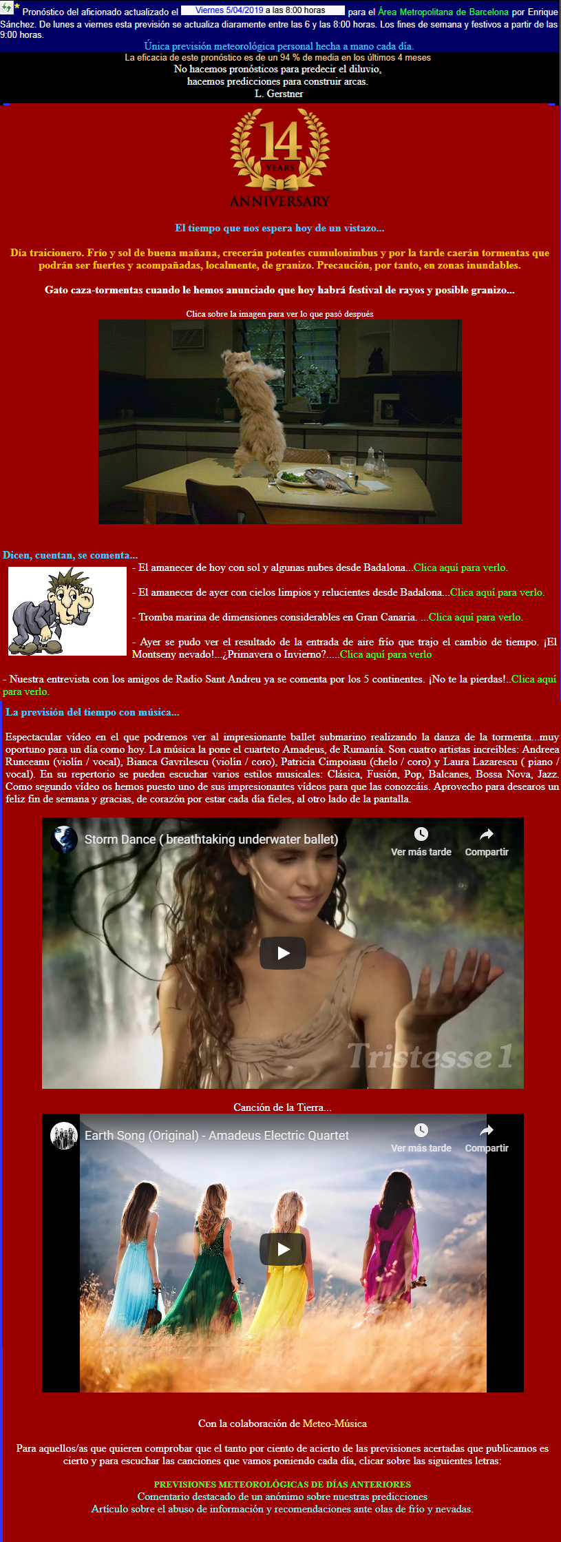 Chubascos sorpresa con tendencia a acabarse por la tarde con ratos de sol. Mañana y el jueves sol y el viernes lluvia. Hoy nos trae la lluvia El Canto del Loco, un grupo español de música Hardcore punk, aunque sus miembros consideran que algunas de sus canciones pertenecen más al género power pop.​ Fue creado en 1994 por Dani Martín e Iván Ganchegui, y años después terminarían por ser cinco miembros.Continuarán los cielos nublados a ratos de sol, con posibilidad de algunas gotas, si es que llegan a caer. .Mi amor, ¿alguna vez has soñado con las gotas de lluvia cubiertas de caramelo? Tu eres la misma, mi dulce lluvia...Así comienza la canción Candy rain de Soul for Real (también conocido como Soul 4 Real y Soul IV Real), un grupo de R&B de Wheatley Heights, Nueva York , que actualmente vive en Atlanta, Georgia. Un pegadizo ritmo que habla de esas gotas de lluvia que, a pesar de no ser de caramelo, pueden caer hoy si las grises nubes se lo permiten.Día nublado con posibilidad de algún chubasco poco importante. Importante que pongáis los subtítulos y los traduzcáis al castellano para ver lo que cuenta la canción de Reese Oliveira que con tan solo 11 años de edad ya era toda una celebridad.  Nos canta: My Heavenly Father Loves Me (Mi padre celestial me ama)Día tranquilamente soleado con nubes decorativas de paseo. Mañana algunos chubascos poco importantes por la mañana. Hoy nos vamos con un regalito para nuestra querida escritora...Montserrat Méliz Altarriba. En el día de su santo, el día la Virgen de Montserra, traemos a un grupo curiosamente desconocido en cataluña. Se llaman los Guaireños, son de Paraguay y nos cantan el tema de la Virgen de Montserrat de una forma preciosa, recordándonos esos cielos azules y soleados que muchas veces presiden la montaña que lleva su nombre. ¡Muchas felicidades!Chubascos y/o alguna tormenta sorpresa. Llevar el paraguas. El tiempo se estabilizará a últimas horas y mañana lucirá un potente sol. Hoy tendremos algunas lluvias  y por eso os proponemos un tipo de precipitación diferente al que seguro que caerá. Que llueva el amor en el mundo...Eso es lo que nos proponen, el cantante puertorriqueño de reggaetón Tito el Bambino y la Novia de América​, la cantante, compositora, actriz, conductora de TV y empresaria mexicana, Lucero