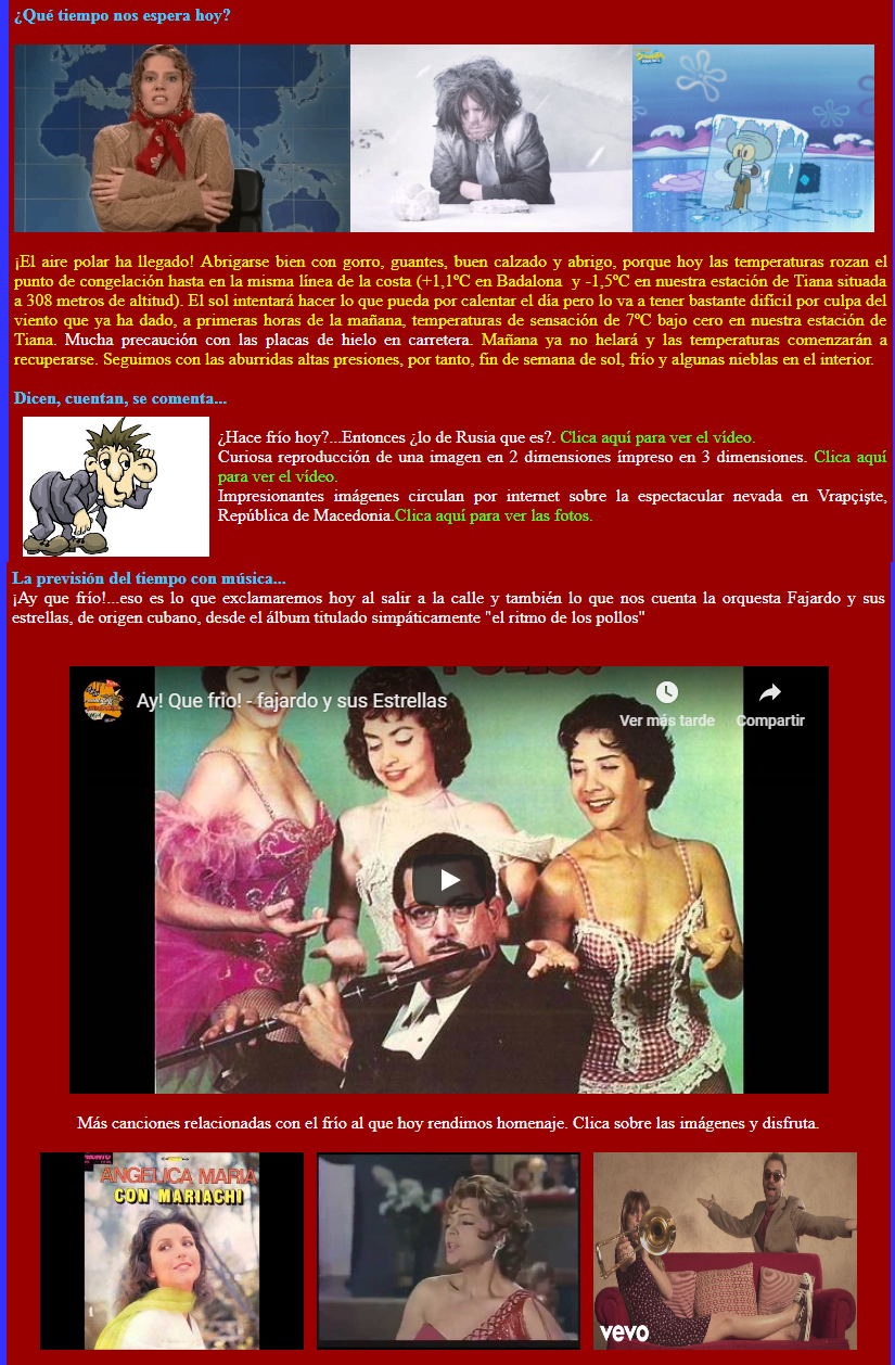 El sol se adueñará del cielo pero en tierra el viento fuerte será el protagonista. Cuidado con macetas voladoras, ramas o troncos de árboles, vallas publicitarias, etc. El viento irá disminuyendo de intensidad a lo largo del día. La sensación de frío será más que notable por su culpa. Aunque hoy el viento no viene del mar, sino del noroeste, esperemos que pronto deje de soplar porque puede causar desperfectos. Hoy encontramos una canción que nos lo dice tal cual...Nos lo canta Gabriel Julio Fernández Capello conocido como Vicentico, un cantante, músico y compositor argentino. Co-fundador y vocalista de la banda Los Fabulosos Cadillacs, comenzó su carrera como solista en 2002. Veamos el vídeo con bellas imágenes.Día en el que tendremos que tener cuidado con las rachas de viento que a partir de la tarde y sobre todo por la noche y madrugada, podrán ser muy fuertes, (rachas máximas de 80 km/h del noroeste). También hay posibilidades de que caigan chubascos que, en la parte alta de la ciudad, podrían ser de anecdóticos copos de nieve. Donde si caerá la nevada del siglo será en el Pirineo. No es un día precísamente para ir de paseo por esa zona... Hoy ya no será el frío el gran protagonista, aunque haga todavía, porque el fuerte viento le toma el relevo. Y así lo reflejamos en la canción escogida para decorar el tiempo previsto en este 4º miércoles del año.  El título no podía ser más explícito "Blow, Big Wind" (sopla, viento fuerte) y nos la interpreta la cantante estadounidense y músico de bluegrass, Laurie Lewis. ¡Disfrutarla con la música y las buenas imágenes de fondo!Frío, mucho frío hoy, por lo que te recomendamos, primero, si conduces, mucha precaución con las placas de hielo que te puedes encontrar en las carreteras y segundo, abrígate bien. El sol se verá con paseo de nubes más abundantes por la tarde. Mañana pasará un frente que puede provocar algún chubasco sorpresa de nieve. Mucho cuidado en la noche de mañana con las rachas de viento del noroeste, que serán muy fuertes. Al frío que hoy es notícia, le vamos a dar ritmo salsero con un viejo tema que llenó las pistas de baile.  Nos lo cantan el Grupo Liberacion y  Costa Chica y nos proponen una acción que hoy será muy necesaria, "tápame tápame".Frío de buena mañana con eclipse de luna incluído. Y así seguiremos con diversos avisos de la Agencia Estatal de Meteorología los próximos días. El sol comenzará el día y tomarán el relevo las nubes que ya de cara a la tarde podrán dejar chubascos. La próxima madrugada, las temperaturas bajarán y es posible ver caer algún chubasco de nieve. Mucho cuidado el miércoles por fuerte temporal con vientos racheados que podrán hacer caer más de un árbol. Muchos somos los que nos gusta ver nevar y esta semana se reparten todos los boletos de la rifa para que nos toque ver algún copo de nieve en nuestra ciudad. Por eso hoy ponemos un deseo, el de poder poner nuestros pasos en la nieve. Ese es el título de la canción de la orquesta y coros de Bebu Silvetti...¿Sabes quien fue? Juan Fernando Silvetti Adorno, más conocido como Bebu Silvetti, fue un pianista, compositor, arreglista y productor discográfico mexicano de origen argentino. Compuso más de 600 temas, unos 200 comerciales para televisión y radio y música original para telenovelas, películas y home vídeos.Hoy la lluvia es la protagonista y las temperaturas más altas. La perturbación podría dar alguna tormenta sorpresa pero, como ya detectamos esta mañana, se irá desgastando y a última hora dejará de llover. Tendremos que tener cuidado también con el aumento de la fuerza del viento que podrá tener rachas de 50 km/h y alterará el mar hasta llegar a la fuerte marejada. Hoy, por supuesto, hablamos de la lluvia. Precísamente con ese título en inglés "rain" nos compuso una canción Rhianna, pero hemos encontrado una versión de dos jóvenes, Abrey y Donel Mangena , que nos ha dejado sin aliento. Ellos luchan en el famoso concurso de la Voz en Reino Unido.Hoy tendremos que seguir abrigándonos porque el frío será vivo, sobre todo a primeras y a últimas horas del día. El sol será protagonista, aunque las nubes no se lo van a poner nada fácil. Mañana llega un frente frío que traerá lluvias, posibilidad de tormentas y quizás, algún copo de nieve por encima de los 500 metros...ya veremos si no baja más la cota. Os lo iremos contando en forma de avisos en esta web y por las redes sociales. Hoy invitamos al cantante, actor y escritor puertorriqueño nacionalizado español,  Ricky Martin para que nos hable del frío...