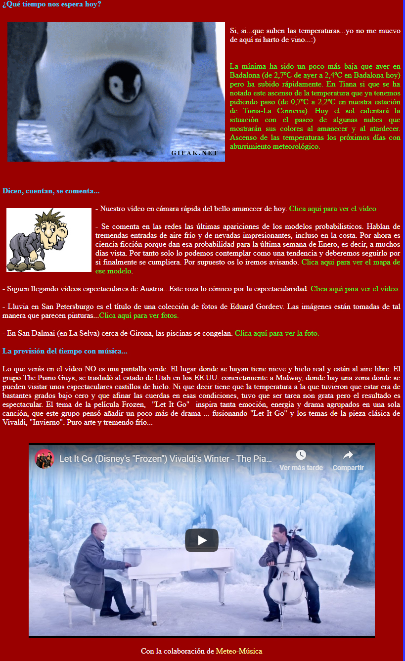 Como ya dijimos ayer, han caído las primeras décimas de litro de lluvia del año. Poca cosa pero eso ya es un cambio de tendencia. Mientras confeccionamos este pronóstico llueve sobre el mar y los peces llevan paraguas :). Hoy las nubes estarán de paseo y aún nos pueden hacer caer algún chubasco sorpresa. Las temperaturas más bajas.  Mi amor, ¿alguna vez sueñas con gotas de lluvia recubiertas de caramelo? Eres igual que mi lluvia de dulces. ¡Qué rico sería! Esa es parte de la canción que hoy os proponemos para encauzar este viernes. Se titula "Candy rain" (lluvia de caramelos) que ya me gustaría que cayeran hoy. Los que nos la cantan son Soul for Real (también conocido como Soul 4 Real y Soul IV Real), un grupo de R&B de Wheatley Heights, Nueva York. Buen ritmo para empezar el viernes y acercarnos al fin de semana.Hoy ya se ven puntos de precipitación, los primeros del año, mar adentro. Las nubes ganarán la partida al sol con un cambio de tiempo y de tendencia. El Anticiclón se irá agotando y la lluvia hará acto de presencia a partir del mediodía o la tarde. No será nada para alucinar pero al menos podremos anotar los primeros litros caídos este año. Este cambio de tiempo abre las puertas a nuevas borrascas  que nos harán temblar de frío la semana próxima...y ahí lo dejo... Bajo la lluvia es un título apropiado para recibir el acuoso meteoro que caerá hoy con mucha probabilidad en nuestra ciudad. Nos lo conta Maykel Mauricio Cedeño Campozano, un cantante de pop y bachata Ecuatoriano. Desde niño ha participado en realitys musicales como "pequeños brillantes" y es más reconocido por su tema A prueba de todo.Día con sol y aumento de nubes. Serán el comité de bienvenida de los nubarrones que tendremos los dos próximos días y que nos traerán lluvias poco importantes. Las temperaturas amanecen un poco más altas que ayer (5,8ºC en Badalona y 5,1ºC en Tiana-La Conreria). Agua y fuego se dan cita en una marchosa canción que aunque habla de una brisa, más bien parece un vendaval. Nos la canta Clean Bandit, una banda de música electrónica, originaria del Reino Unido.Día tranquilo y con menos viento que ayer, básicamente soleado pero con paseo de nubes. Las temperaturas mínimas son lo frías que se esperan para la época en la que estamos (4,8ºC en Badalona y 4,6ºC en Tiana-La Conreria) Hoy nos vamos a  "Le berceau de la vie" (la cuna de la vida) de Michel Pépé, autor-compositor francés autodidacta, de origen italiano. Está considerado en Francia y en muchos países como uno de los compositores de música con más talento de la Relajación y el Bienestar. Y eso es lo que necesitamos en nuestras grandes ciudades...un poco de calma y relajación. No os perdáis las preciosas  y meteorológicas imágenes que acompañan a la música.Hoy ya no hará falta abrigarse tanto como en días pasados porque las temperaturas han subido claramente. De los 2,4ºC de ayer, a los 10ºC  de hoy en Badalona y de los 2,7ºC a los 7,1ºC en Tiana- La Conreria, una muy buena diferencia de mínimas. El sol será el protagonista del día junto al viento que soplará con fuerza, sobre todo en comarcas del sur y del norte. Aquí en la costa alguna racha molesta. Bonito estribillo del grupo Congal Tijuana que nos va a llenar de positivismo el primer día de la semana. Congal Tijuana es un proyecto de música original e independiente que tiene como objetivo recorrer el mundo tocando y promoviendo su mensaje positivo.  En esta ocasión asistimos a una clase de baile Mamá&bebé del Museo Regional Temuco en la que fue la inauguración de la Semana Internacional de la Crianza en Brazos de la Agrupación de Apoyo a la Crianza, Temuco en el centro de ChileHoy han subido un poco las temperaturas. Fresco hace, pero menos que ayer. Estamos ante las puertas del viento polar que llegará esta noche con la posibilidad de algún chubasco o tormenta. El batacazo de la cota de nieve será descomunal, de 1500 a 500 metros en pocas horas. Estaremos atentos a la posibilidad, aunque remota, de ver algún copo de nieve en nuestra ciudad y sobre todo, no nos cansaremos de decirlo, de que tengáis precaución por la formación de placas de hielo en carretera a partir de mañana.  Alerta roja en alta mar por grandes olas. Con una voz dulce y suave, que nos recuerda que no hace falta pegar gritos para cantar bien, Song Ji-eun, una cantautora, y actriz surcoreana, nos habla de un amor utilizando el frío como vehículo conductor de la letra de su canción. Para disfrutar de unos momentos de relajante música en un mundo en el que todo es estrés, ruido y rapidez.