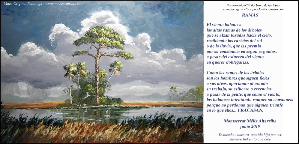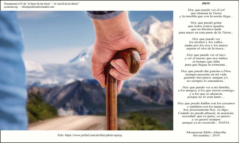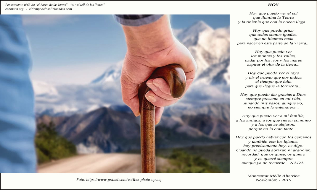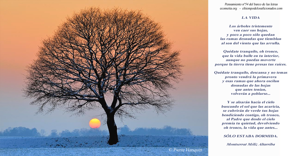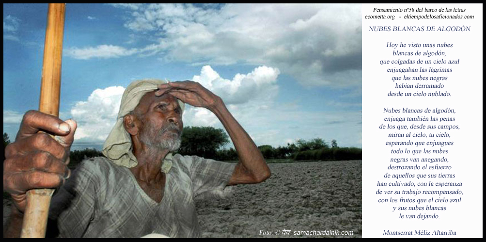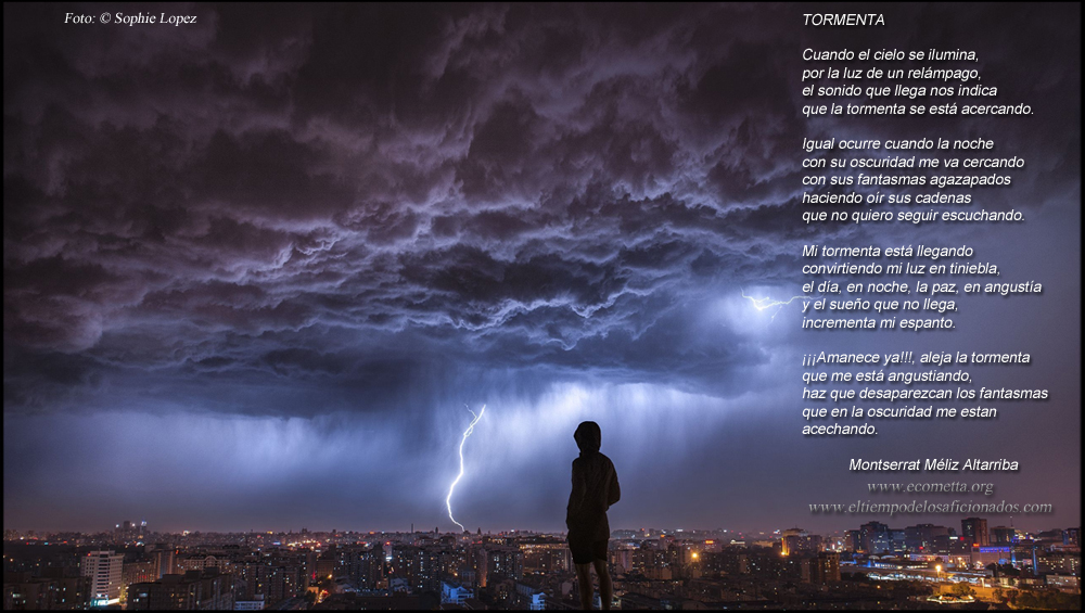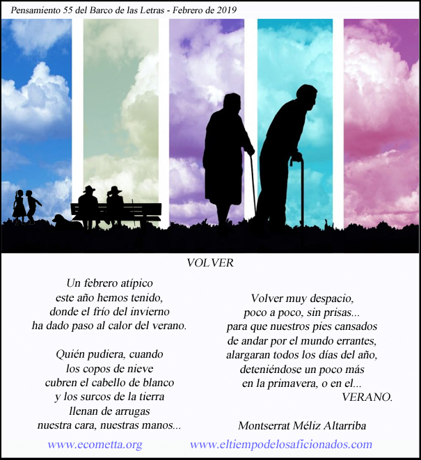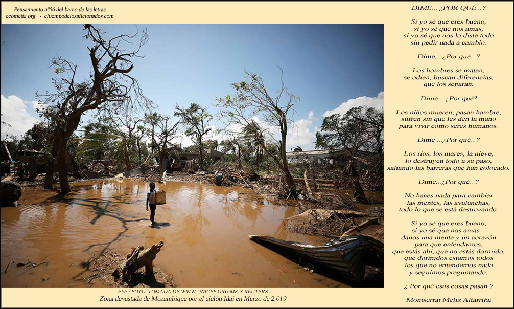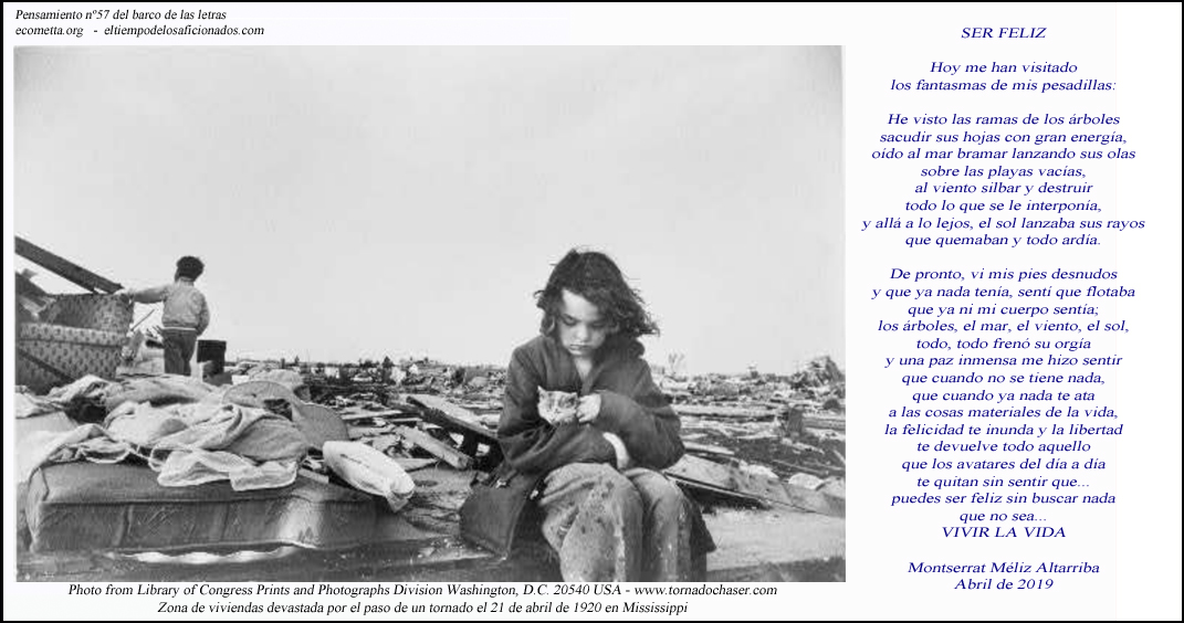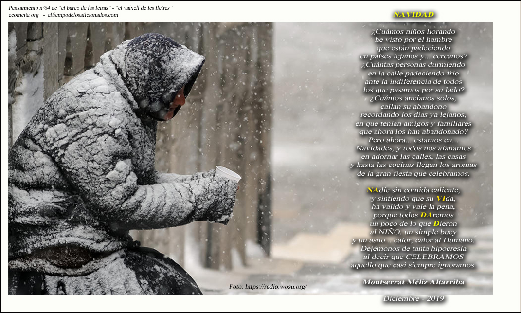 ÚLTIMO PENSAMIENTO PUBLICADO PENSAMIENTO Nº64 - DICIEMBRE 2019 Finalizamos el 2019 con este último pensamiento que publicamos justamente el día de Reyes de 2020. Un toque de atención duro a estas fiestas en las que hemos ido a toda velocidad, comprando eufóricamente, deambulando y compartiendo calles que son el único techo de los que lo han perdido todo, incluso las ilusiones. Miramos a otro lado a una realidad que mañana o pasado puede ser la nuestra, dado que nadie está exento del fracaso por muy bien que le vayan las cosas. Es momento de reflexionar y de desterrar de una vez por todas, a partir de este nuevo año, la palabra "indiferencia". Gracias, Montserrat, por esta lección de humildad que debemos hacer todos y cada uno de los que te seguimos fielmente, en la que ya se ha convertido en la sección más visitada de la literatura meteorológica de nuestro país. ![]() *********************************************************************************** PENSAMIENTO Nº63 - NOVIEMBRE 2019 ![]() *********************************************************************************** PENSAMIENTO Nº62 - OCTUBRE 2019 ![]() Web donde encontramos la foto: https://www.pinterest.co.kr/pin/339951471869114243/?lp=true *********************************************************************************** PENSAMIENTO Nº61 - SEPTIEMBRE 2019 ![]() Clica aquí para ir a la página web donde hemos encontrado la imagen que acompaña a la poesía. *********************************************************************************** PENSAMIENTO Nº60 - JULIO - AGOSTO 2019 ![]() *********************************************************************************** PENSAMIENTO Nº59 - JUNIO 2019 ![]() Galería de pinturas de Mazz *********************************************************************************** PENSAMIENTO Nº58 - MAYO 2019 ![]() *********************************************************************************** PENSAMIENTO Nº57 - ABRIL 2019 ![]() Web donde encontramos la foto: http://tornadochaser.com/education/historical-tornado-photos/ Información sobre este suceso meteorológico excepcional *********************************************************************************** PENSAMIENTO Nº56 - MARZO 2019 ![]() Recordamos que... ...El ciclón tropical Idai ha sido uno de los peores ciclones tropicales de los que se tiene constancia en África y en todo el hemisferio sur. Se originó el 4 de Marzo de 2019 delante de la costa africana y alcanzó vientos de 205 km/h (125 mph) y una presión atmosférica en su centro de 940 hPa. Se estima que perdieron la vida más de 1000 personas. Afectó a Mozambique, Malawi, Madagascar y Zimbabue. Los medios de información practicamente ni lo comentaron. *********************************************************************************** PENSAMIENTO Nº55 - FEBRERO 2019 ![]() *********************************************************************************** PENSAMIENTO Nº54 - ENERO 2019 Clica aquí para ir a la magnífica galería fotográfica de Pierre Hanquin NO TE PIERDAS LOS PENSAMIENTOS PUBLICADOS DESDE 2014 HASTA 2018 CLICANDO AQUÍ >>> |