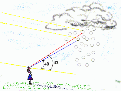 En la siguientes imágenes podemos ver hasta 4 veces el violeta. Es una arco iris supernumerario. ¿Los Arco Iris nos ayudan a predecir el tiempo local? Pues si...Si el arco iris lo vemos por la tarde puede signifcar el fin de la tormenta y por tanto la llegada de la estabilidad, pero si lo vemos por la mañana es muy probable que vuelva a llover, ya que el calor del mediodía puede alimentar nuevas tormentas. ¿Porqué el Arco Iris tiene forma de arco y no es cuadrado o triangular...? ![]() El equipo familiar de "el Tiempo de los Aficionados" construyó esta maqueta para poderlo explicar. En realidad el Arco Iris no es un arco si no un circulo completo como podéis ver en las curiosidades que se encuentran en el lateral izquierdo de esta sección. Pero la línea del horizonte nos corta por la mitad ese circulo creando el arco. Para que yo vea colores reflejados en las gotas, es condición indispensable que el ángulo en el que yo mire hacia la lluvia respecto al horizonte sea entre 40º (azul) y 42º (rojo) en el arco primario y 52º (rojo) y 54º(Azul) en el arco secundario. En la maqueta solo hemos hecho el primaro para que sea más facil. Clica sobre la imagen para ir a la fuente de donde la hemos extraído. Centremos nuestra atención en una sola gota de la cual nos llega un rayo rojo. ¿Qué relación tienen con ella las otras gotas que nos envían el color rojo? El ángulo que forma nuestra línea de visión a esas gotas con los rayos del sol debe ser el mismo para todas. Es decir, todas las gotas que emiten el rayo rojo en nuestra dirección, se encuentran sobre la superficie de un cono cuyo vértice es nuestra cabeza. Tal y como vemos en la maqueta, es algo así como que cada color se mueve por un embudo y nuestro ojo es el agujero del embudo. El rojo se mueve por un embudo ancho; el violeta por un embudo más estrecho. Y los rayos se ven como provenientes de la base del embudo respectivo. Como