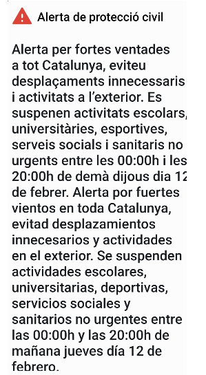 ES- Alert ![]() 48,0 km/h NE ![]() Min 11,0ºC Màx 13,0ºC 4,8 mm ![]() ![]() | 20![]() 53,0 km/h NE ![]() Min 8,9ºC Màx 11,4ºC 9,8 mm ![]() ![]() ![]() |