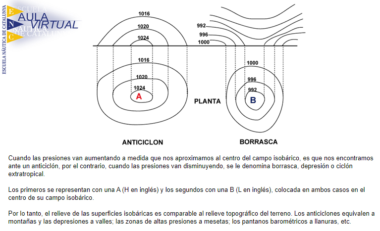Com podem veure al mapa isobàric (mapa en què les línies uneixen punts d'igual pressió atmosfèrica) la Borrasca situada a l'Atlàntic té una pressió atmosfèrica menor a la de l'Anticicló situat al nord d'Europa. La Borrasca és una àrea depresionaria, està enfonsada respecte al que l'envolta (gràfic de la dreta en blau) . ![]() ![]() interessant explicació ![]() Per entendre una